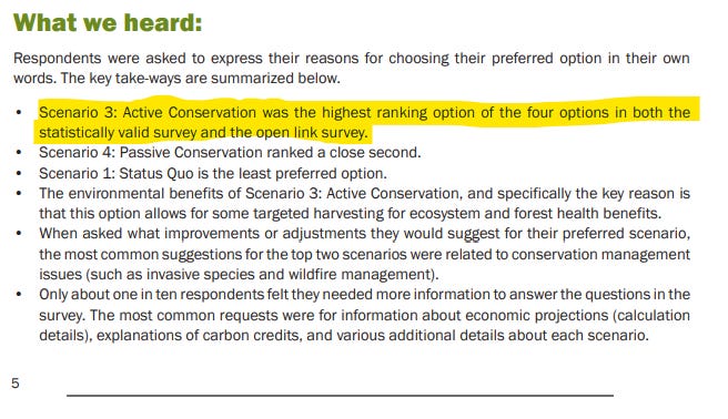 When Active Conservation is combined with Reduced Harvest and Status Quo options, a clear majority of respondents supported a forest that continues to be harvested in some form.